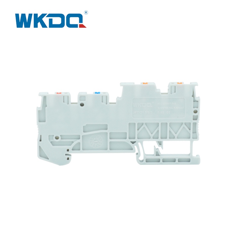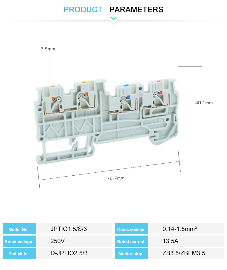 PTIO1.5/S/3 TERMINAL Blok Blok minal mengadopsi nilon PA66 yang tahan api, konduktor kuningan dan pegas kompresi stainless steel untuk memastikan keamanan listrik dan kekuatan mekanik di bawah kondisi kerja yang keras.