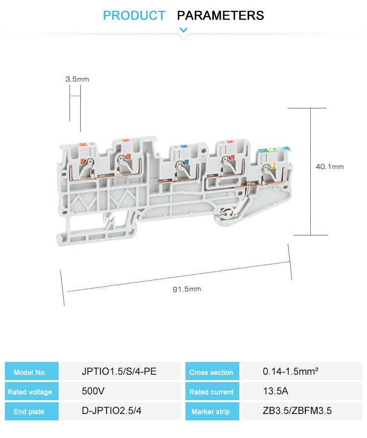 Terbuat dari nilon PA66 tahan api rekayasa dengan logam sekrup kuningan. Terbuat dari nilon PA66 tahan api rekayasa dengan logam sekrup kuningan. Blok terminal sambungan dorong ditandai dengan pengkabelan konduktor yang mudah dan bebas alat dengan ferrule atau konduktor padat. Desain kompak dan sambungan depan memungkinkan pengkabelan di ruang terbatas. Selain fasilitas pengujian pada poros fungsi ganda, semua blok terminal menyediakan sambungan uji tambahan. Dengan kaki universal yang dapat dipasang pada Din Rail NS 35. Dapat menghubungkan dua konduktor dengan mudah, penampang konduktor yang besar pun tidak menjadi masalah. Distribusi potensial listrik dapat menggunakan jembatan tetap di pusat terminal. Semua jenis aksesori: Penutup ujung, Penghenti Ujung, Pelat partisi, penanda trip, jembatan tetap, jembatan penyisipan, dll.