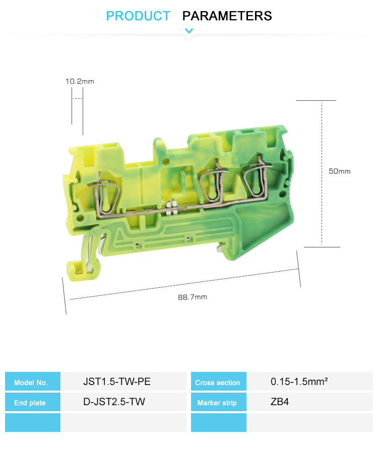 Blok Terminal Greating Tipe GRATIS ST1.5.5-TW-PE GRATIS mengadopsi desain klip pegas yang inovatif, mendukung alat cepat instalasi gratis dari kabel 1.5mm ² dan menyediakan koneksi grounding seismik yang stabil. Struktur melingkar yang ringkas meningkatkan stabilitas mekanis dan cocok untuk landasan pelindung peralatan industri, bangunan, dan sistem tenaga perumahan. Dibandingkan dengan terminal sekrup tradisional, secara signifikan memperpendek waktu pemasangan dan mudah dipelihara, memastikan keamanan listrik dengan kinerja yang andal dan memenuhi kebutuhan landasan modern dari beragam skenario